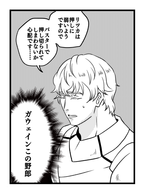 バスターで押し切ろうとするガウェインのまんがを描きました。CCCイベントネタなのでやってない人にはなんのこっちゃかも知れません。